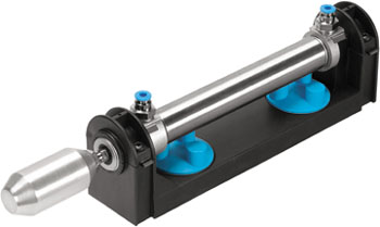The piston rod of a double acting cylinder is operated by the reciprocal input of compressed air at the front and back of the cylinder. The end position damping is adjustable via two regular screws. The piston of the cylinder contains a permanent solenoid which can be used to operate a proximity switch.